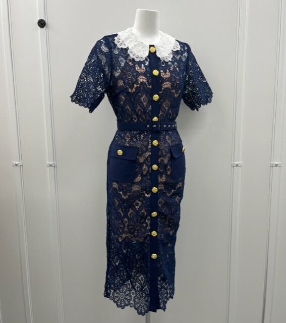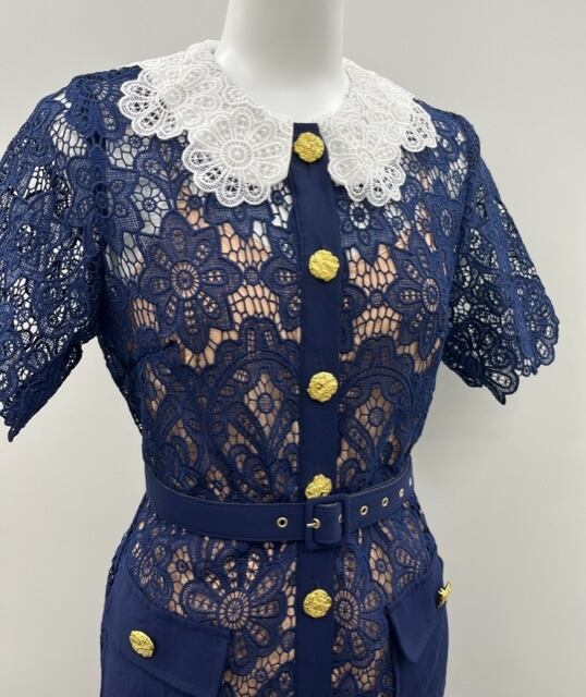 総レースで金ボタン、ベルト付きの華やかなネイビーの