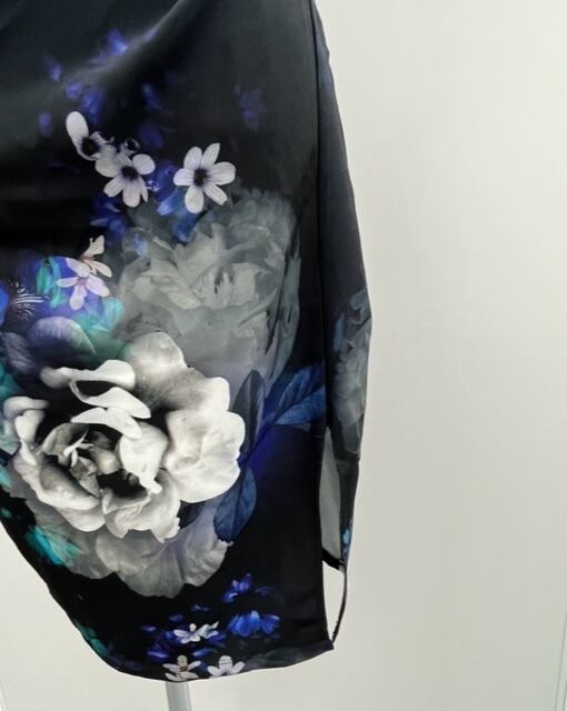 黒ベースに、モノトーンやブルー系の大きめの花柄がプリントされた
