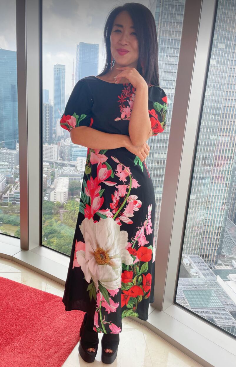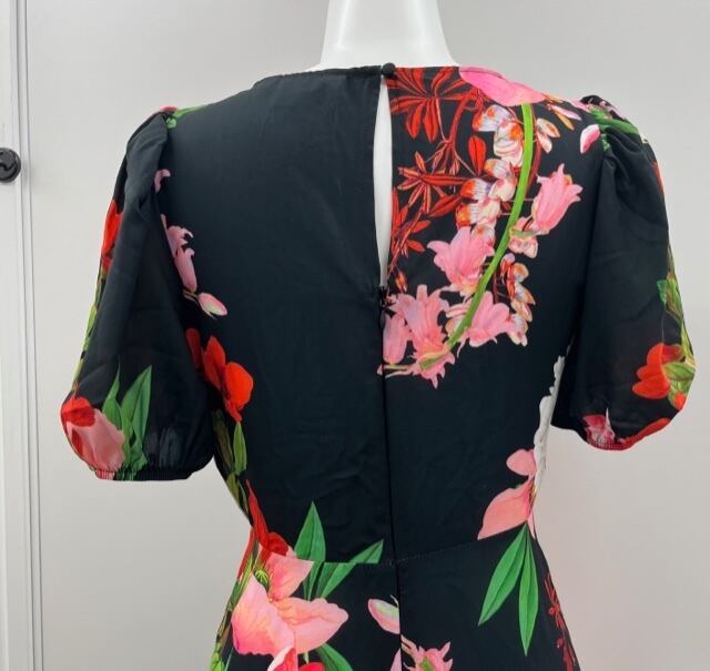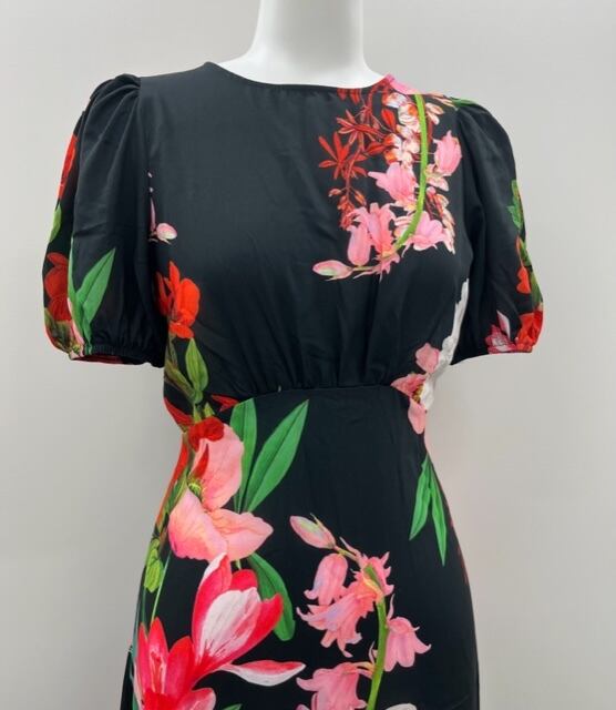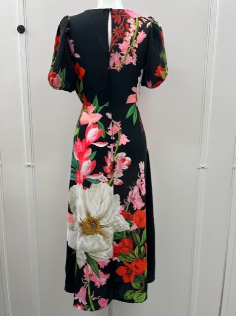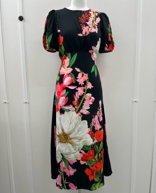黒ベースに大柄のフラワープリントの華やかなワンピースです