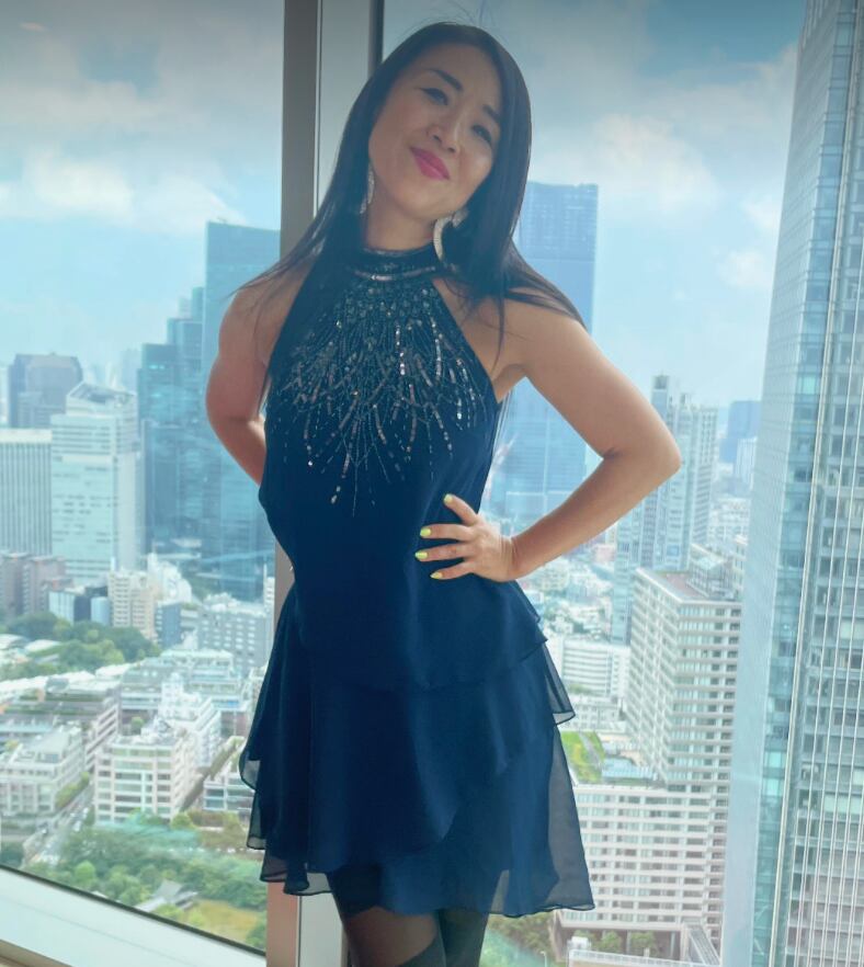 ネイビーのベースに、首元から胸元までスパンコールやビーズ、