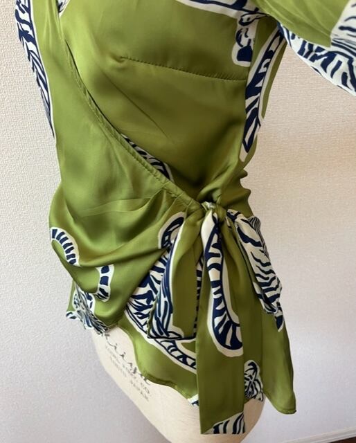 前でクロスさせるタイプのカシュクールシャツで、フェミニンなデザインなので