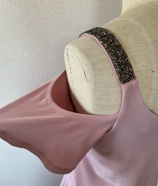 くすみピンクのトップスで、シルバーのビジューがストラップに