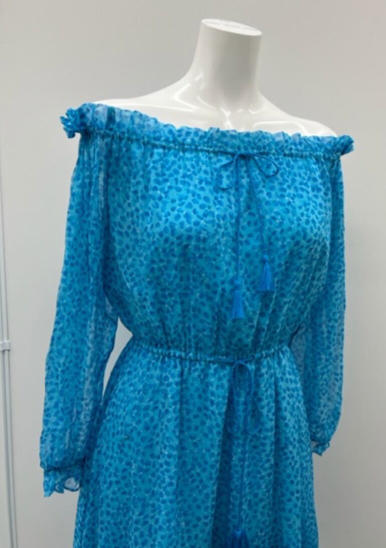 肩はオフショルダーにしたり、紐で首元のあきをコントロールしたりと