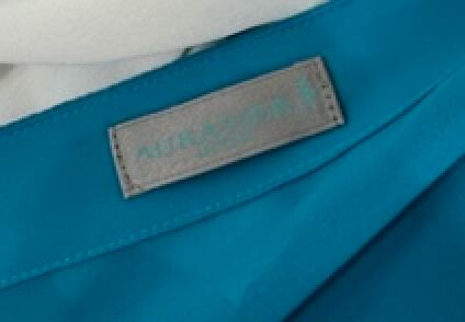 ターコイズBLUEで、後ろ身頃が無地、前身頃にプリントとロゴが入った
