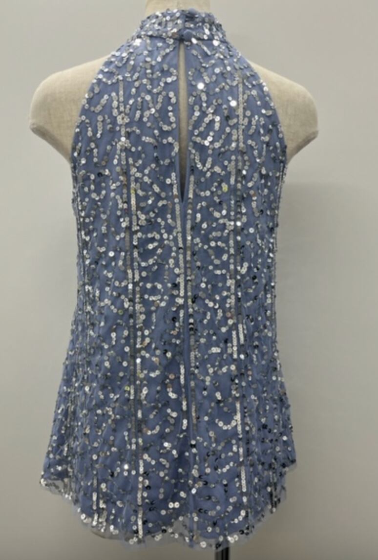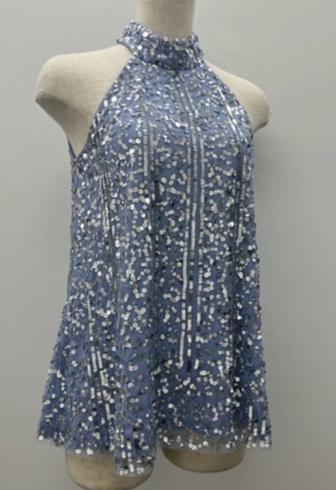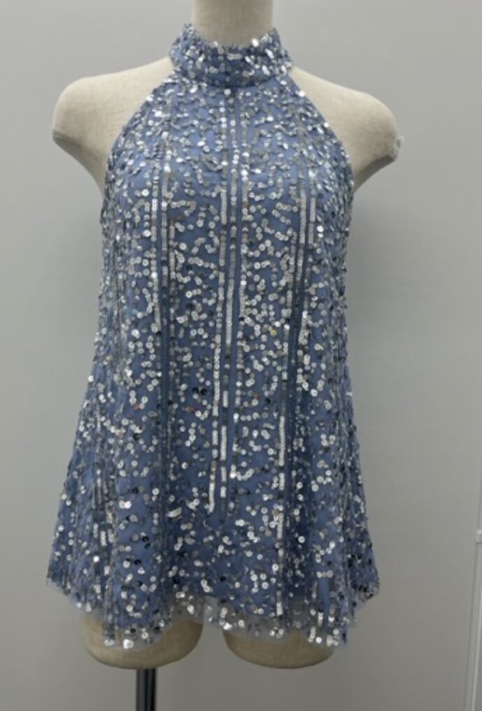 グレーの生地の上にSILVERのスパンコールが施された、トップスです