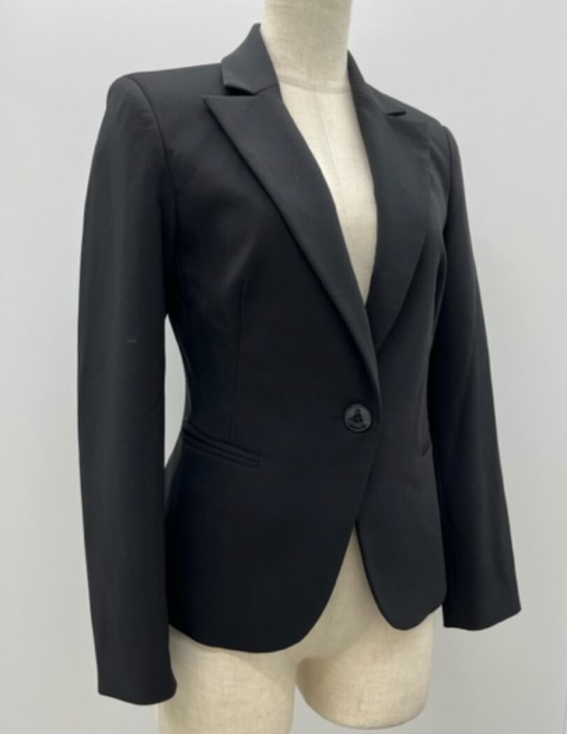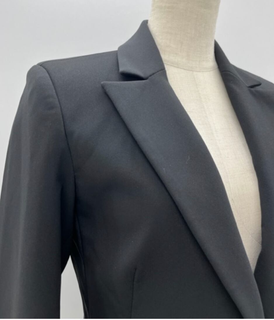1つボタンでシャープなピークドラペル、ストレッチ素材で