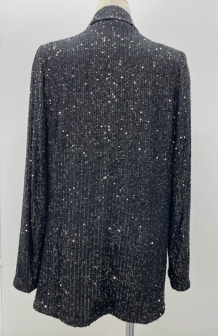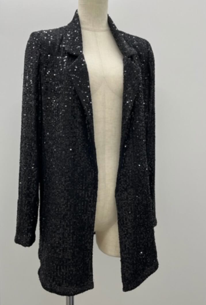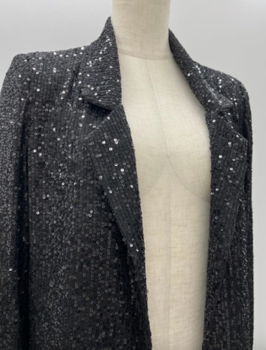 全体にBLACKのスパンコールが施されたジャケットで、華やかなドレスの羽織りとして