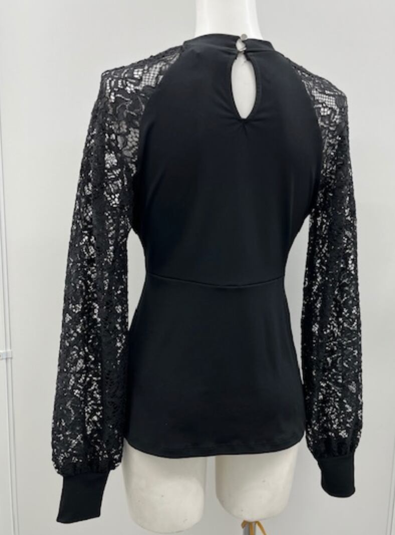 BLACK★袖レース!胸元スリット!カットソー!ウエストシェープ!