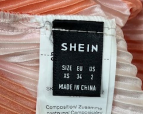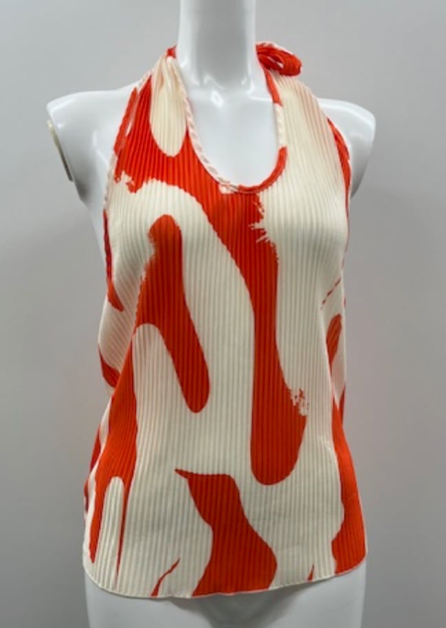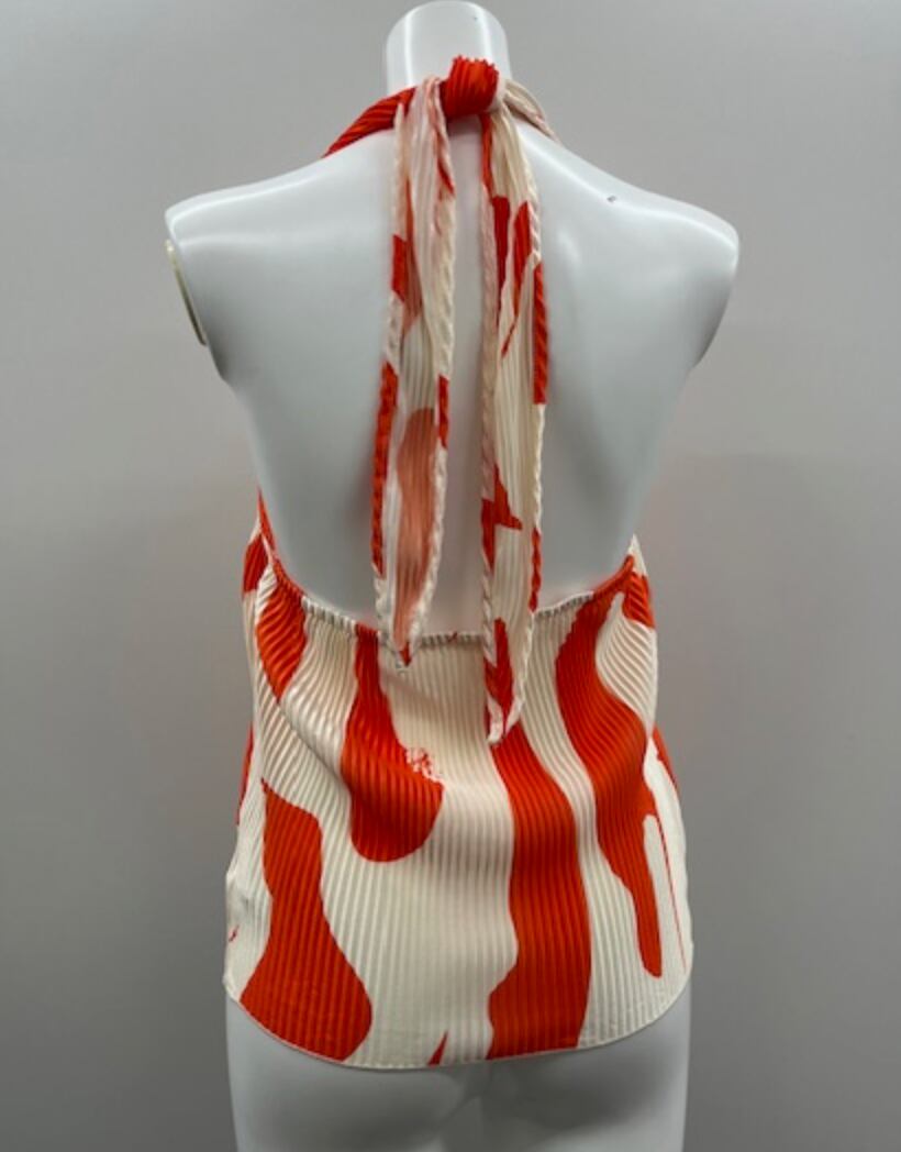 オレンジのプリントトップスは、大胆なプリントで素材はプリーツです