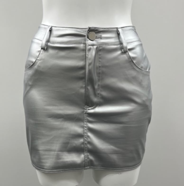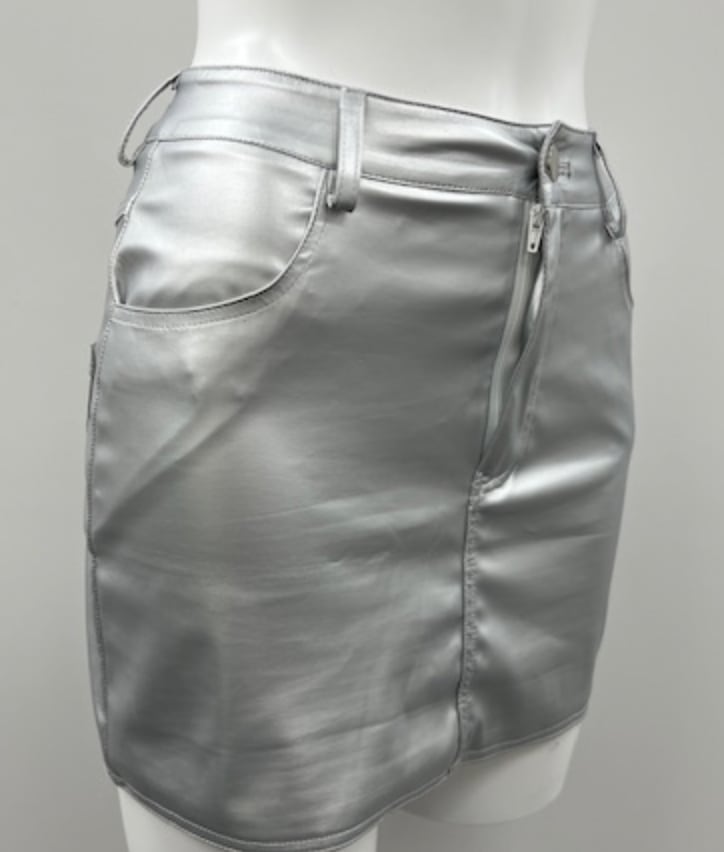 シルバーのミニスカートはエコレザーでストレッチが効いています
