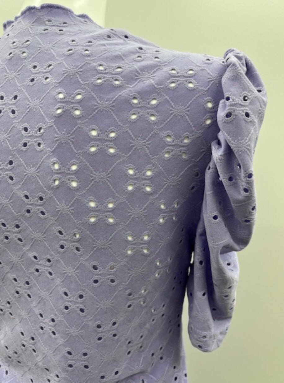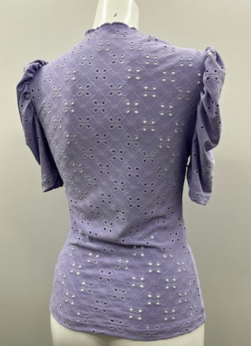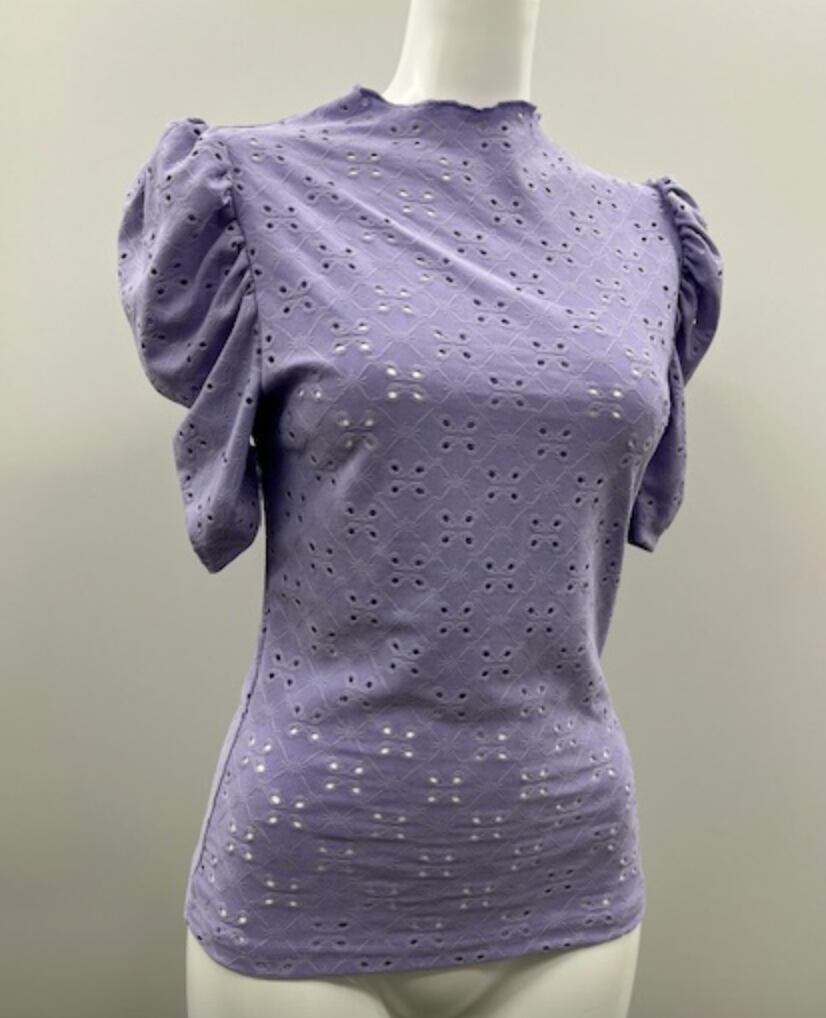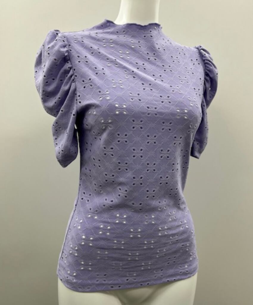 パープルのトップスは、ボトルネックで袖がパフスリーブになっていて
