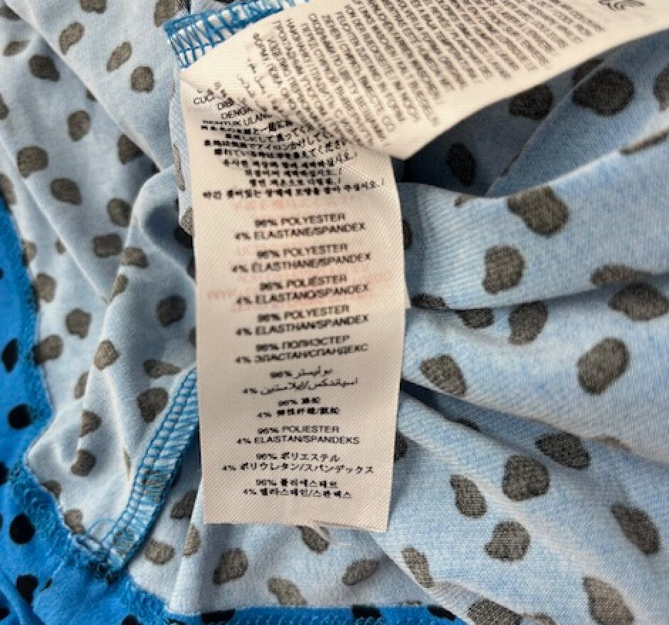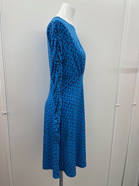 ターコイズブルーに黒のドットプリントが華やかさを演出します