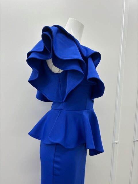 ワンショルダーでフリルが重なった立体的なデザインで、ウエスト部分にも