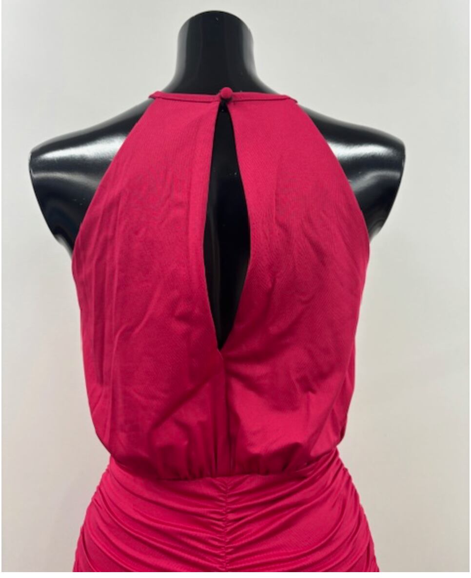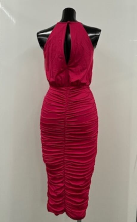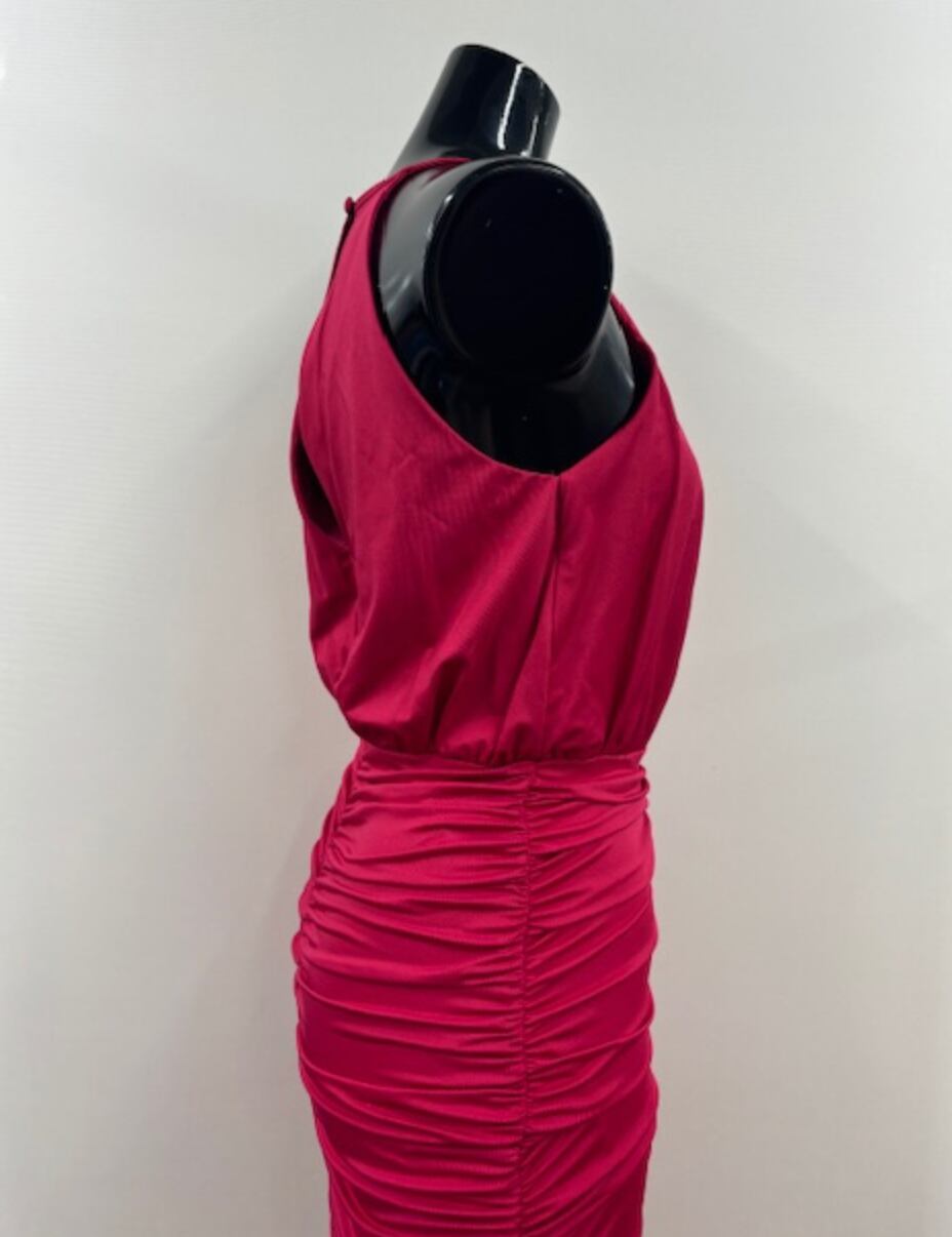 全体にシャーリングが施された鮮やかな赤のワンピです