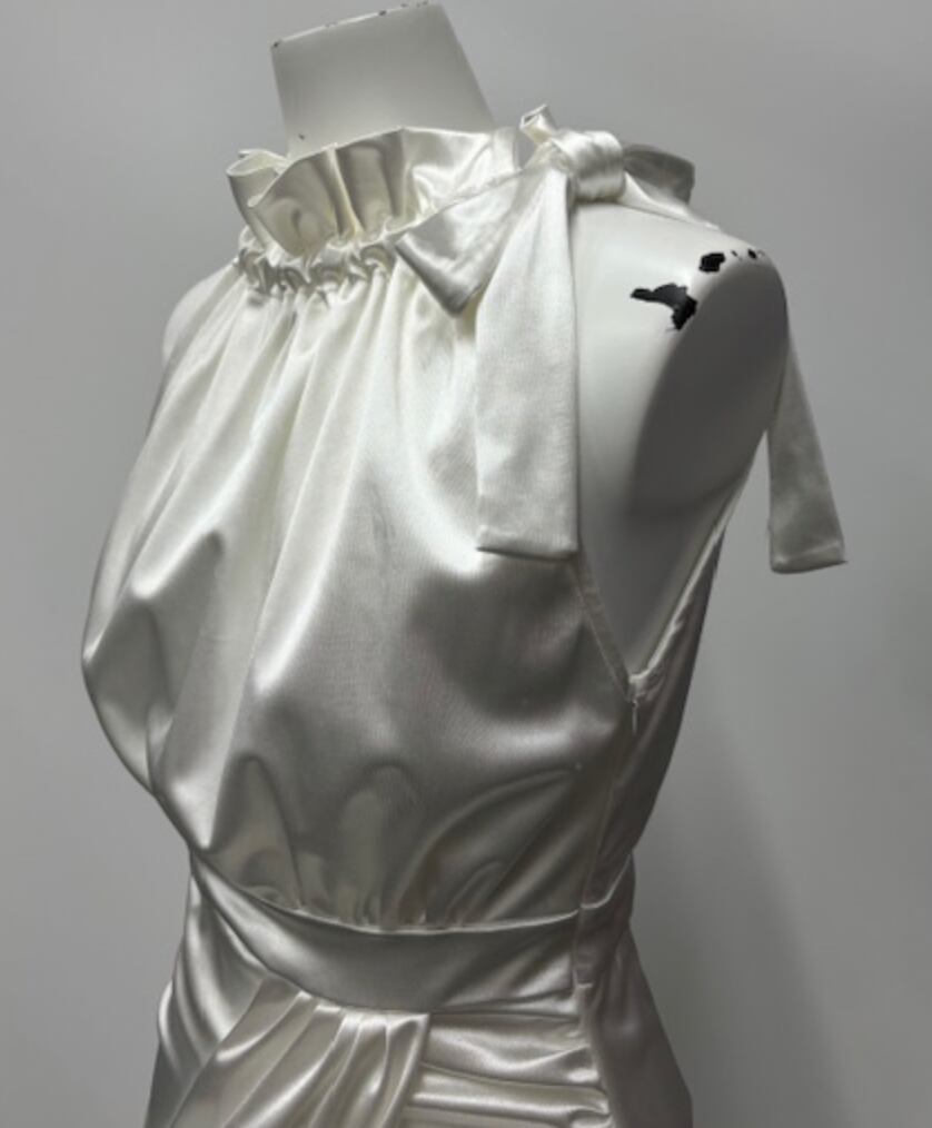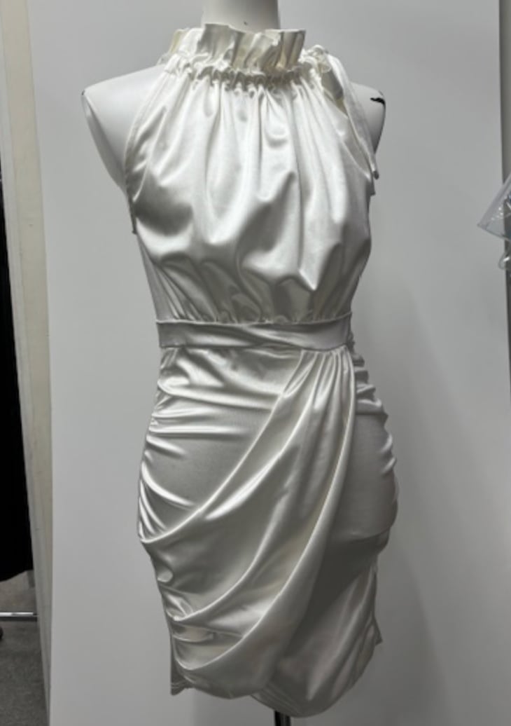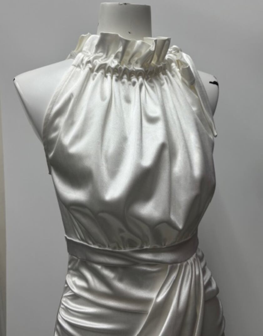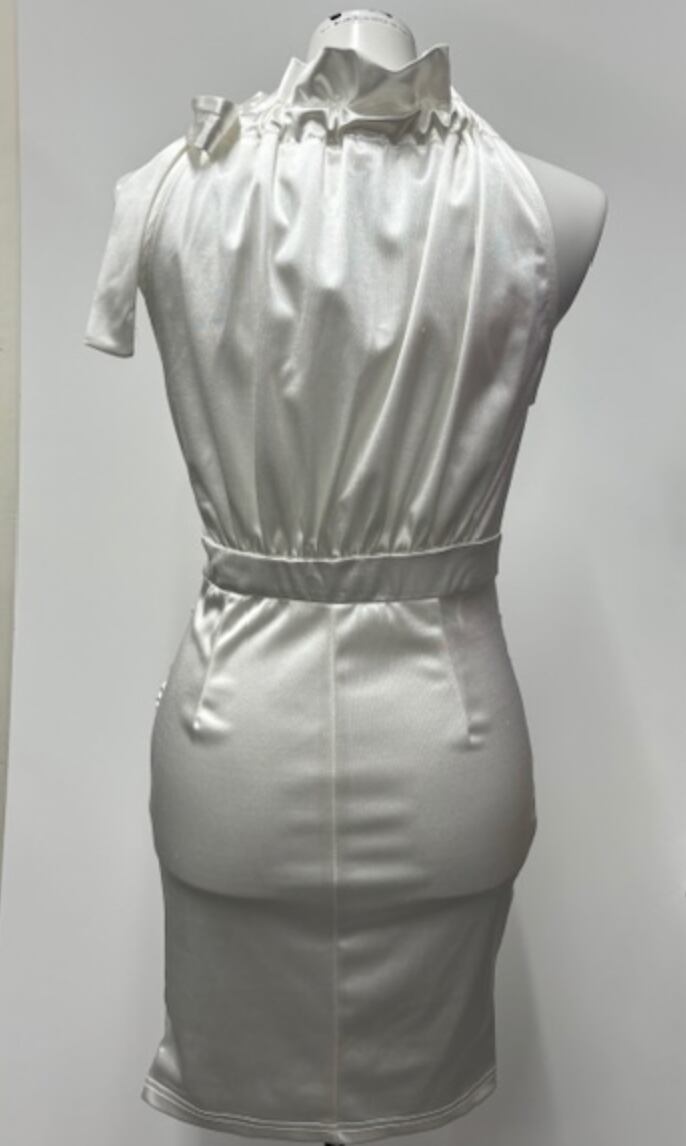 ホワイト★ギャザーアシンメトリー!アメリカンスリーブ!サテンワンピ!