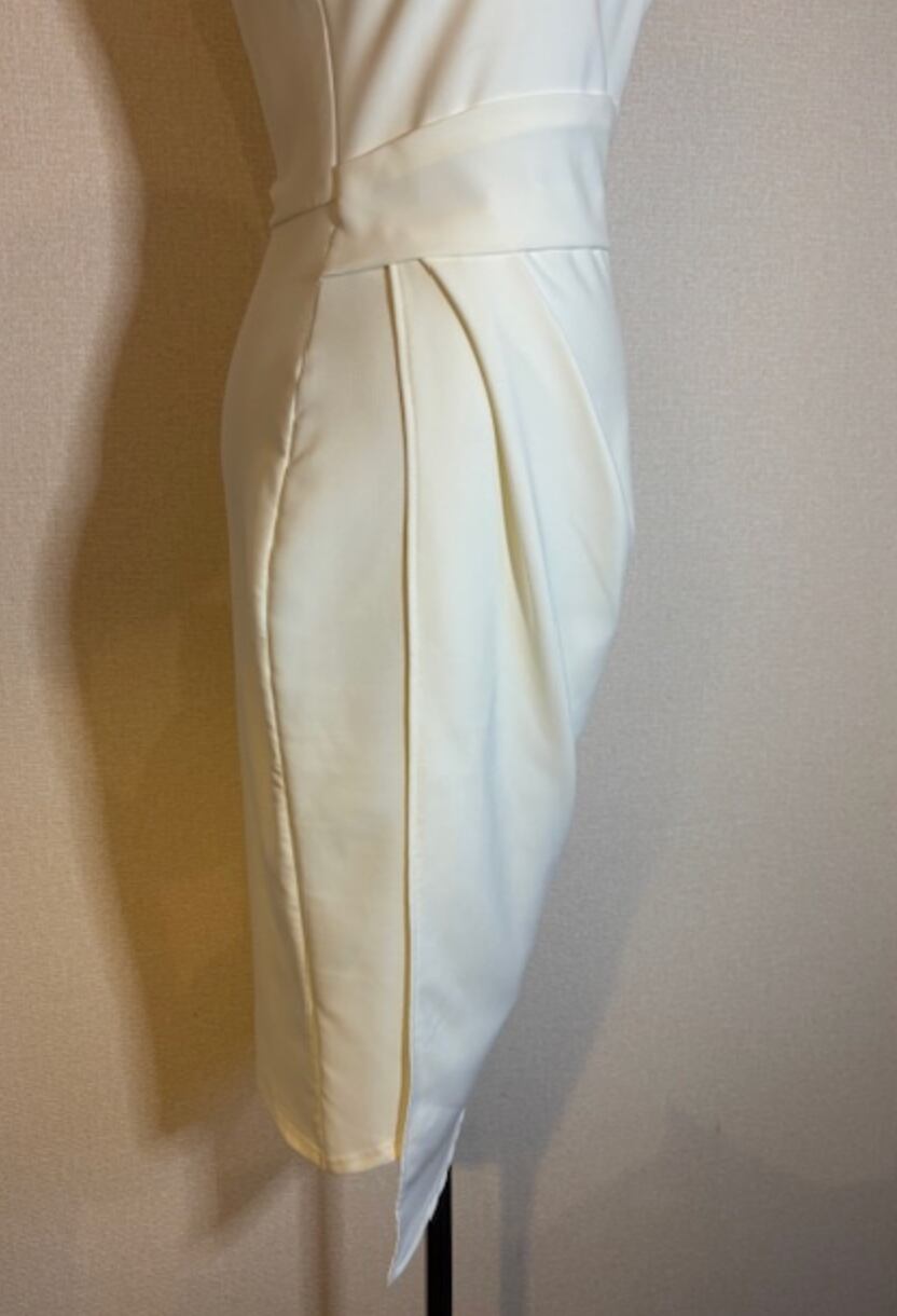 ウエスト部分にポイントがあり、裾の長さがアシンメトリーになっています