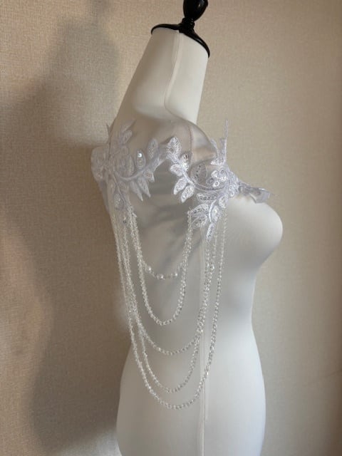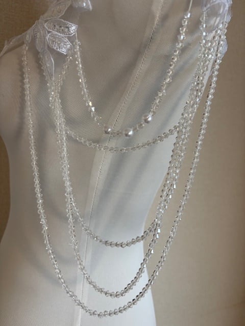 肩らか腕にかけてクリアのネックレスが下がるデザインです。