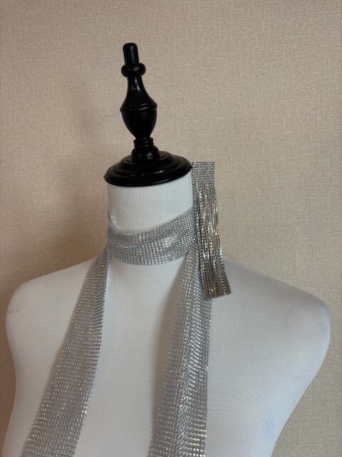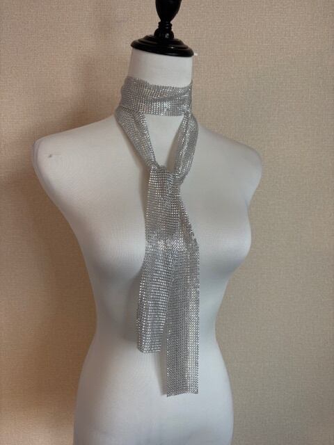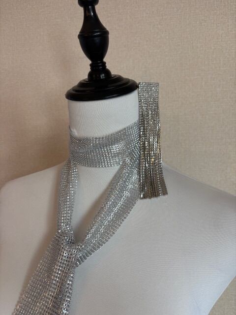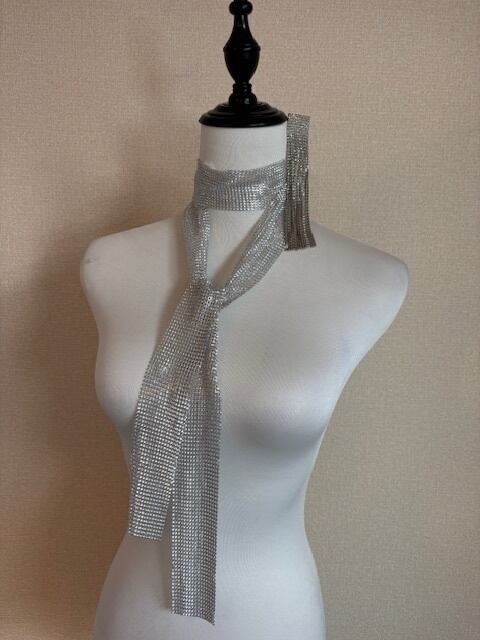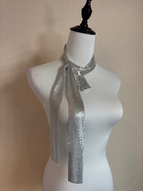 メタル素材のネックレスはボータイのようにに巻きつけて