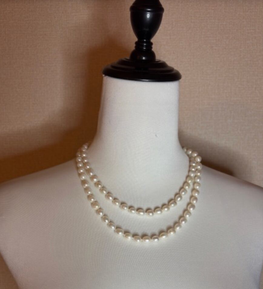 シンプルなパールのネックレスは長めなのでいろいろなアレンジが可能です